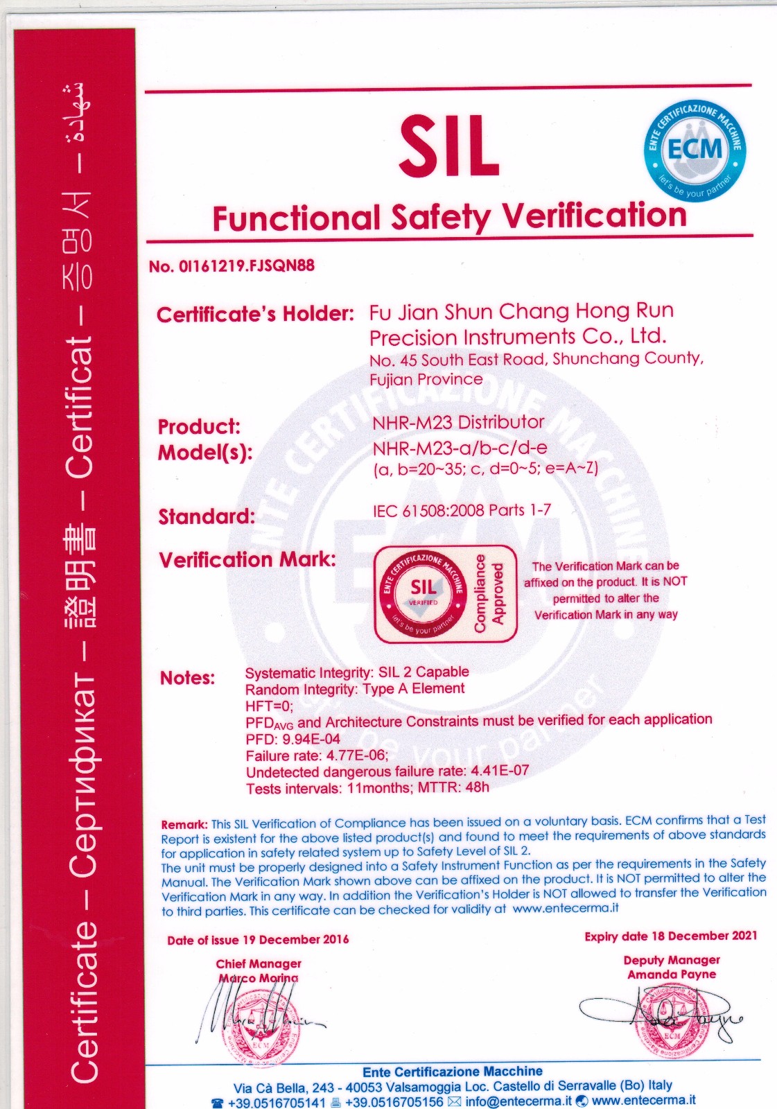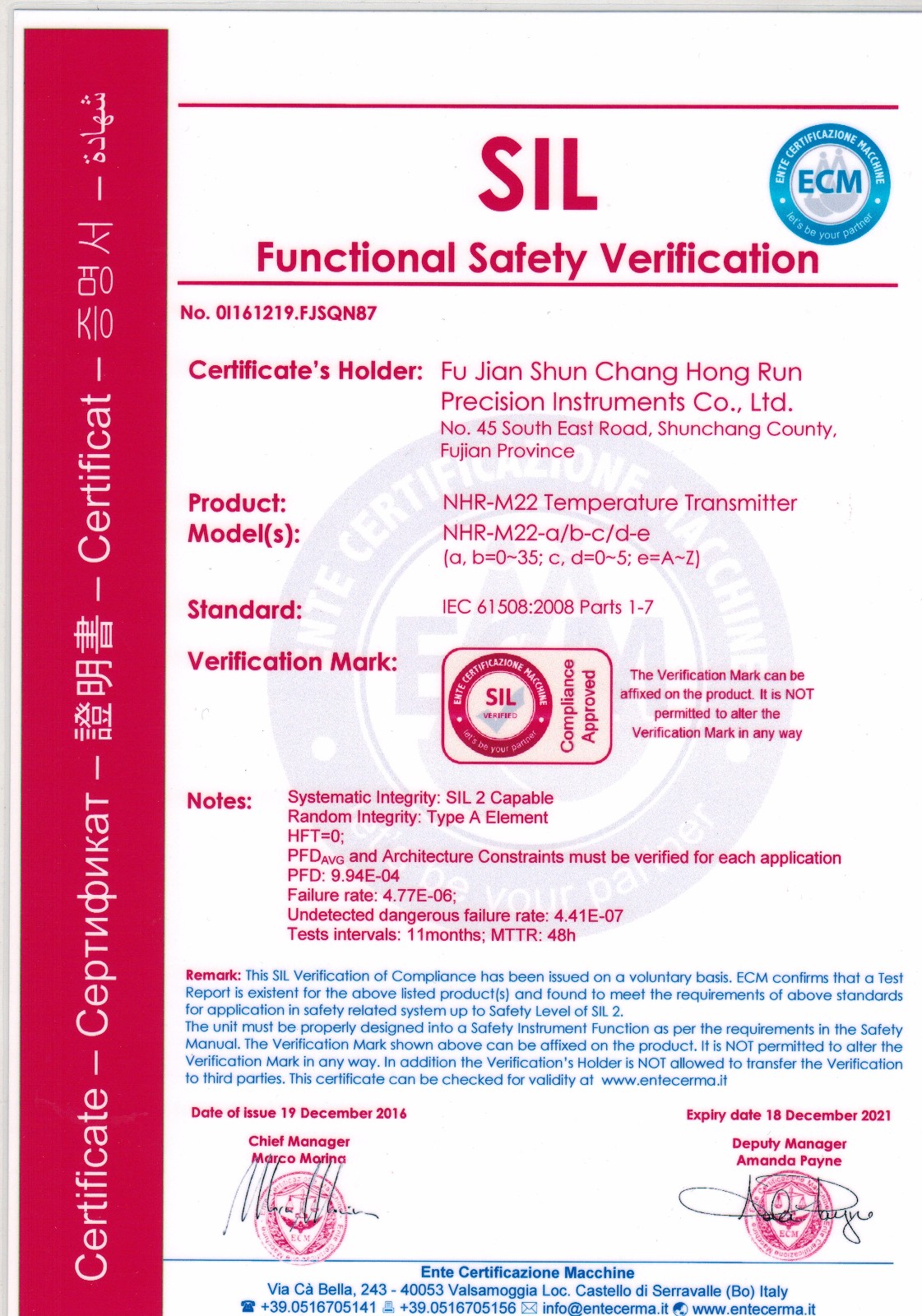 近日,虹潤(rùn)智能儀表系列產(chǎn)品再傳喜訊,虹潤(rùn)兩款智能儀表產(chǎn)品NHR-M22溫度變送器、NHR-M23配電器獲得了國際SIL2功能安全認(rèn)證證書。這標(biāo)志著虹潤(rùn)儀表產(chǎn)品的安全性達(dá)到了國際標(biāo)準(zhǔn)。也為虹潤(rùn)產(chǎn)品實(shí)現(xiàn)走向世界的美好愿景再一次打下了堅(jiān)實(shí)的硬件基礎(chǔ)。