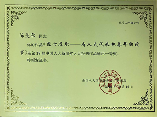 《匠心履職——省人大代表林善平的故事》獲得28屆中國人大新聞獎(jiǎng)人大報(bào)刊作品通訊一等獎(jiǎng)