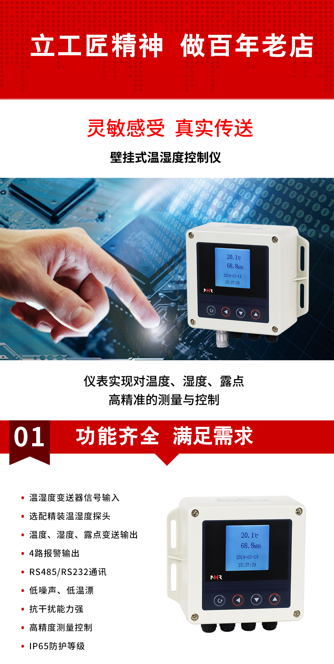 虹潤(rùn)公司是專業(yè)生產(chǎn)環(huán)境監(jiān)測(cè)儀表的國(guó)家專精特新“小巨人”企業(yè)。生產(chǎn)的壁掛式溫濕度控制器,具有溫度、濕度、露點(diǎn)高精準(zhǔn)的測(cè)量,多種輸出類型,穩(wěn)定性強(qiáng),RS485/RS232通訊,IP65防護(hù)等級(jí)等特點(diǎn)。產(chǎn)品獲得一種手持式低功耗溫濕度檢測(cè)儀、大屏幕溫濕度記錄儀等2項(xiàng)國(guó)家發(fā)明專利,主持起草物聯(lián)網(wǎng)智能溫度儀表通用技術(shù)條件、冷鏈溫度記錄儀等2項(xiàng)國(guó)家標(biāo)準(zhǔn),通信系統(tǒng)多通道數(shù)據(jù)采集控制終端規(guī)范軍用標(biāo)準(zhǔn),以及現(xiàn)場(chǎng)設(shè)備集成等5項(xiàng)智能制造國(guó)家標(biāo)準(zhǔn),參與國(guó)際5G標(biāo)準(zhǔn)制定,取得溫濕度儀表等2項(xiàng)相關(guān)軟件著作權(quán)。產(chǎn)品廣泛應(yīng)用于工業(yè)現(xiàn)場(chǎng)、農(nóng)業(yè)大棚、倉(cāng)儲(chǔ)物流、地下管廊、養(yǎng)殖孵化、配電機(jī)房等諸多領(lǐng)域。