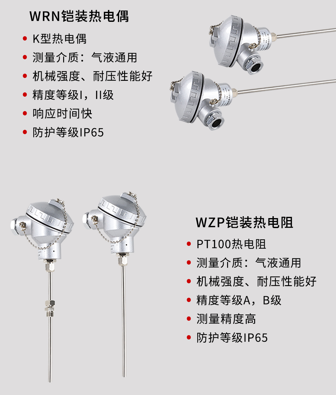 鎧裝式熱電阻熱電偶作為溫度測量傳感器,通常與溫度變送器、調節(jié)器及顯示儀表等配套使用,組成過程控制系統(tǒng),用以直接測量或控制各種生產過程中流體、蒸汽和氣體介質以及固體表面等溫度。