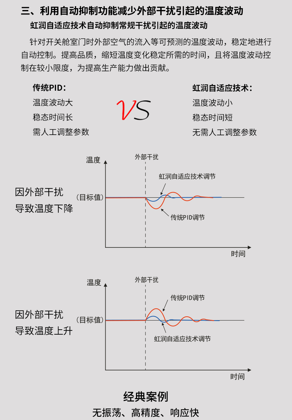 虹潤公司是專業(yè)生產(chǎn)溫控器的國家專精特新“小巨人”企業(yè)。生產(chǎn)的傻瓜式智能溫控器,具有傻瓜式操作,真正人工智能算式,無需人工整定參數(shù),控制精度可達(dá)±0.1°C,高抗干擾等特點(diǎn)。產(chǎn)品獲得模糊PID控制儀及控制方法、人工智能調(diào)節(jié)器、智能化控制器、移相觸發(fā)控制器、閥門自動手動無擾動操作控制方法及裝置等5項(xiàng)國家發(fā)明專利,主持起草工業(yè)過程控制系統(tǒng)用模擬輸入兩位或多位輸出儀表、物聯(lián)網(wǎng)智能溫度儀表通用技術(shù)條件、工業(yè)過程測量和控制系統(tǒng)用智能調(diào)節(jié)器等3項(xiàng)國家標(biāo)準(zhǔn),以及通信系統(tǒng)多通道數(shù)據(jù)采集控制終端規(guī)范軍用標(biāo)準(zhǔn),參與國際5G標(biāo)準(zhǔn)制定,取得傻瓜式模糊PID調(diào)節(jié)儀等3項(xiàng)相關(guān)軟件著作權(quán)。產(chǎn)品廣泛應(yīng)用于電力、石化,冶金、制藥、食品等幾乎所有工業(yè)現(xiàn)場,實(shí)現(xiàn)精準(zhǔn)控溫,保障生產(chǎn)安全與質(zhì)量。