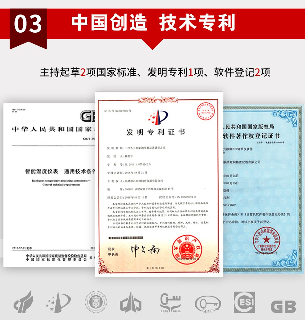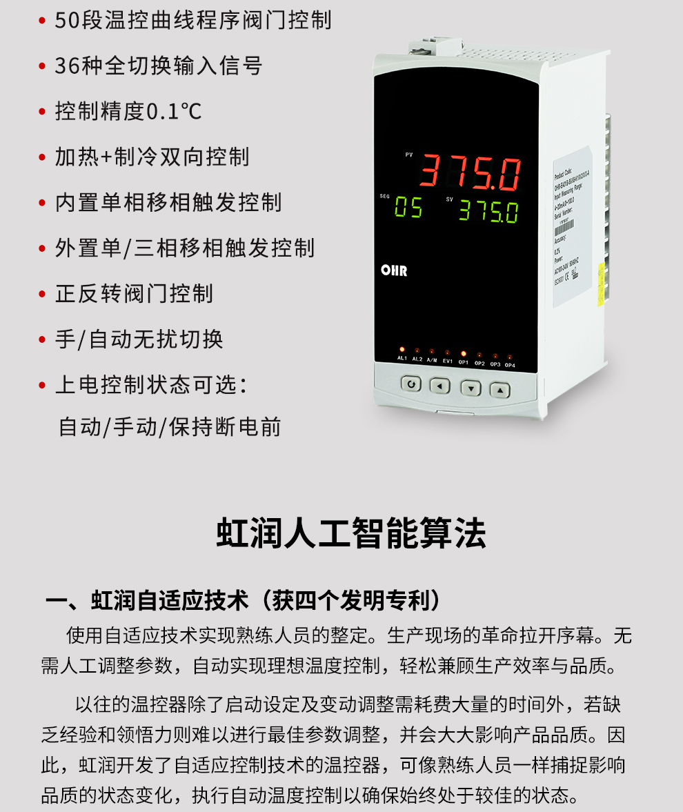 虹潤公司是專業(yè)生產(chǎn)溫控器的國家專精特新“小巨人”企業(yè)。生產(chǎn)的程序閥門溫控器,具有50段溫控程序控制,真正人工智能算式,無需人工整定參數(shù),控制精度可達(dá)±0.1°C,加熱制冷雙向控制等特點(diǎn)。產(chǎn)品獲得模糊PID控制儀及控制方法、人工智能調(diào)節(jié)器、智能化控制器、移相觸發(fā)控制器、閥門自動(dòng)手動(dòng)無擾動(dòng)操作控制方法及裝置等5項(xiàng)國家發(fā)明專利,主持起草智能溫度儀表通用技術(shù)條件、工業(yè)過程控制系統(tǒng)用模擬輸入兩位或多位輸出儀表、工業(yè)過程測量和控制系統(tǒng)用智能調(diào)節(jié)器等3項(xiàng)國家標(biāo)準(zhǔn),,以及通信系統(tǒng)多通道數(shù)據(jù)采集控制終端規(guī)范軍用標(biāo)準(zhǔn),參與國際5G標(biāo)準(zhǔn)制定,取得增強(qiáng)型分段調(diào)節(jié)器等3項(xiàng)相關(guān)軟件著作權(quán)。產(chǎn)品廣泛應(yīng)用于電力、石化,冶金、制藥、食品等幾乎所有工業(yè)現(xiàn)場,實(shí)現(xiàn)精準(zhǔn)控溫,保障生產(chǎn)安全與質(zhì)量。