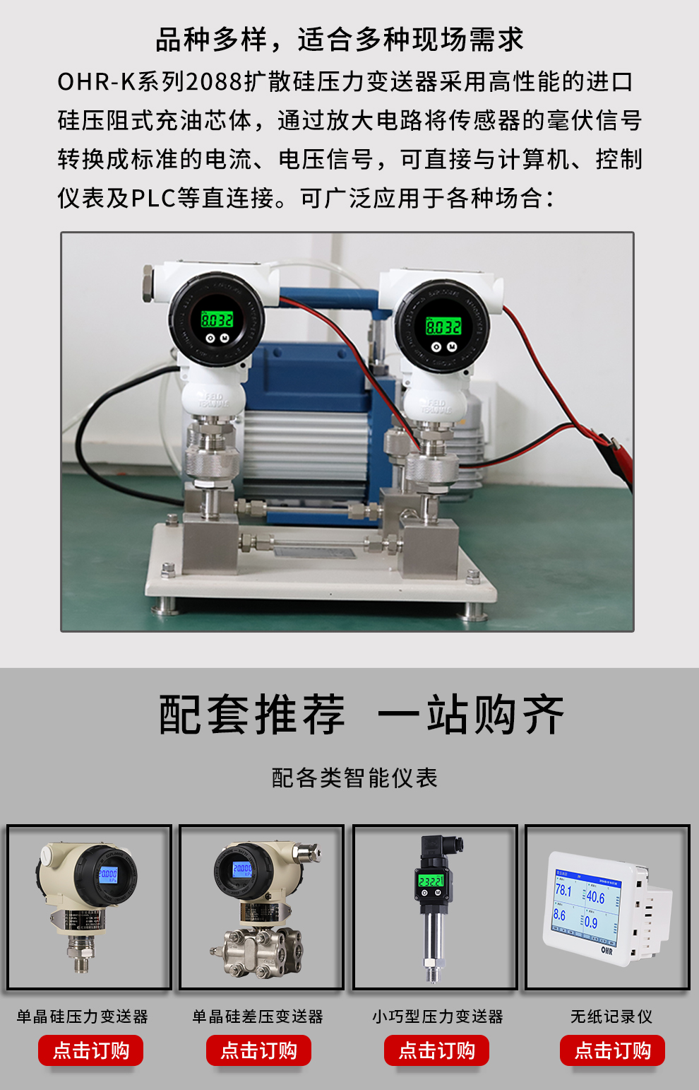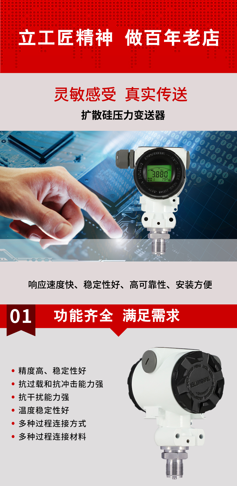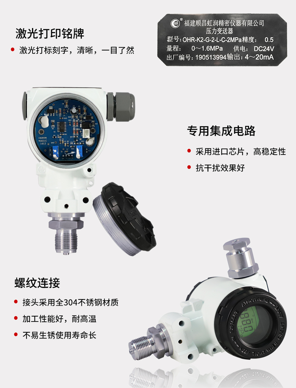虹潤公司是專業(yè)生產(chǎn)壓力變送器的國家專精特新“小巨人”企業(yè),生產(chǎn)的擴散硅壓力變送器,具有精度高,穩(wěn)定性好,響應(yīng)速度快,高可靠性,抗過載和抗沖擊能力強,安裝方便等特點。產(chǎn)品獲得一種數(shù)字顯示低功耗壓力表、一種信號發(fā)生器裝置等2項國家發(fā)明專利,主持起草工業(yè)過程控制系統(tǒng)用模擬輸入兩位或多位輸出儀表、工業(yè)過程測量和控制系統(tǒng)用壓力/差壓變送器等2項國家標(biāo)準(zhǔn),通信系統(tǒng)多通道數(shù)據(jù)采集控制終端規(guī)范軍用標(biāo)準(zhǔn),以及現(xiàn)場設(shè)備集成等5項智能制造國家標(biāo)準(zhǔn)。參與國際5G標(biāo)準(zhǔn)制定,取得數(shù)顯壓力表等2項相關(guān)軟件著作權(quán)。產(chǎn)品廣泛應(yīng)用于化工、食品、制藥、電力、設(shè)備配套、供暖、水處理、樓宇等行業(yè),需精準(zhǔn)測量流體壓力的現(xiàn)場。