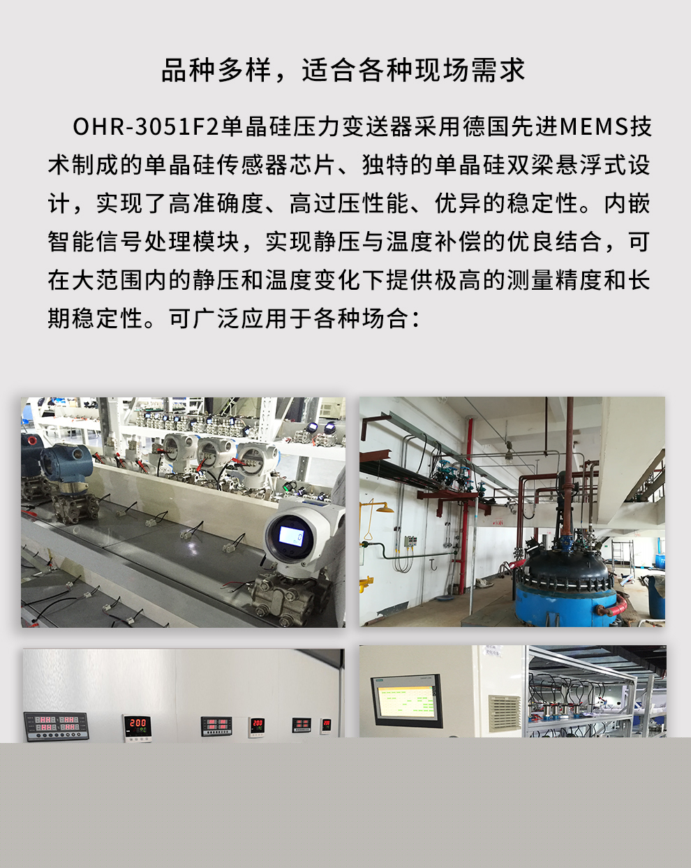 虹潤(rùn)公司是專(zhuān)業(yè)生產(chǎn)壓力變送器的國(guó)家專(zhuān)精特新“小巨人”企業(yè),生產(chǎn)的單晶硅壓力變送器,具有高精度,小溫漂,性能穩(wěn)定,帶HART通訊,抗干擾能力強(qiáng),自診斷功能等特點(diǎn)。產(chǎn)品獲得一種數(shù)字顯示低功耗壓力表、一種信號(hào)發(fā)生器裝置等2項(xiàng)國(guó)家發(fā)明專(zhuān)利,主持起草工業(yè)過(guò)程控制系統(tǒng)用模擬輸入兩位或多位輸出儀表、工業(yè)過(guò)程測(cè)量和控制系統(tǒng)用壓力/差壓變送器等2項(xiàng)國(guó)家標(biāo)準(zhǔn),通信系統(tǒng)多通道數(shù)據(jù)采集控制終端規(guī)范軍用標(biāo)準(zhǔn),以及現(xiàn)場(chǎng)設(shè)備集成等5項(xiàng)智能制造國(guó)家標(biāo)準(zhǔn)。參與國(guó)際5G標(biāo)準(zhǔn)制定,取得數(shù)顯壓力表等2項(xiàng)相關(guān)軟件著作權(quán)。產(chǎn)品廣泛應(yīng)用于化工、食品、制藥、電力、設(shè)備配套、供暖、水處理、樓宇等行業(yè),需精準(zhǔn)測(cè)量流體壓力的現(xiàn)場(chǎng)。