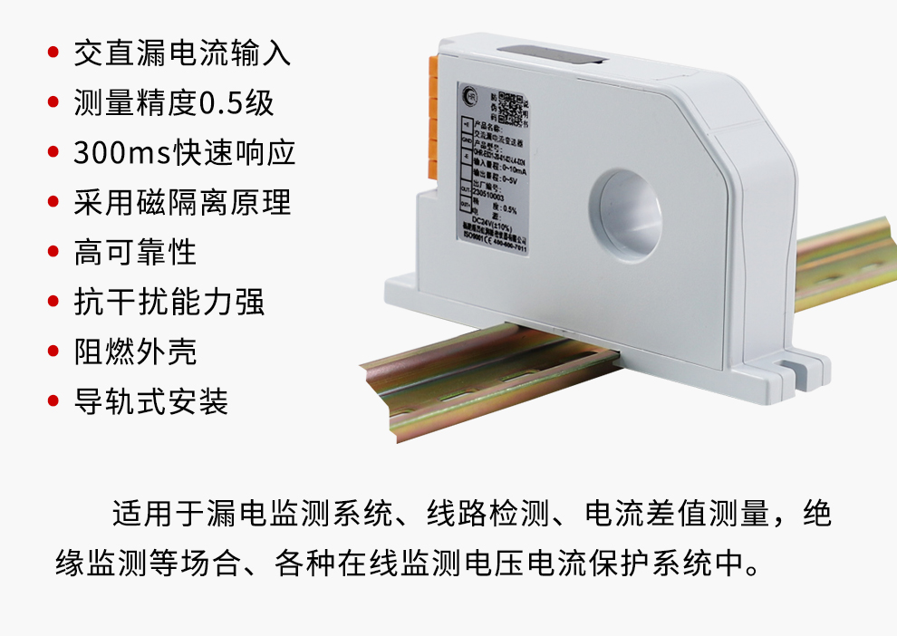 虹潤公司是專業(yè)生產電流傳感器的國家專精特新“小巨人”企業(yè)。生產的交流/直流漏電流變送器,具有交直漏電電流輸入、高精準測量、響應速度快、高抗干擾、全隔離設計等特點。產品獲得一種交流信號變送器、交直流信號轉換電路、基于DCS技術的盤裝式三相電量表等3項國家發(fā)明專利,主持起草工業(yè)過程控制系統(tǒng)用模擬輸入兩位或多位輸出儀表國家標準,直流漏電流傳感器規(guī)范、通信系統(tǒng)多通道數據采集控制終端規(guī)范等2項軍用標準,以及現場設備集成等5項智能制造國家標準,參與國際5G標準制定。產品廣泛應用于工業(yè)自動化、電力、新能源、科研實驗基礎設施等需要電力參數監(jiān)測的領域。