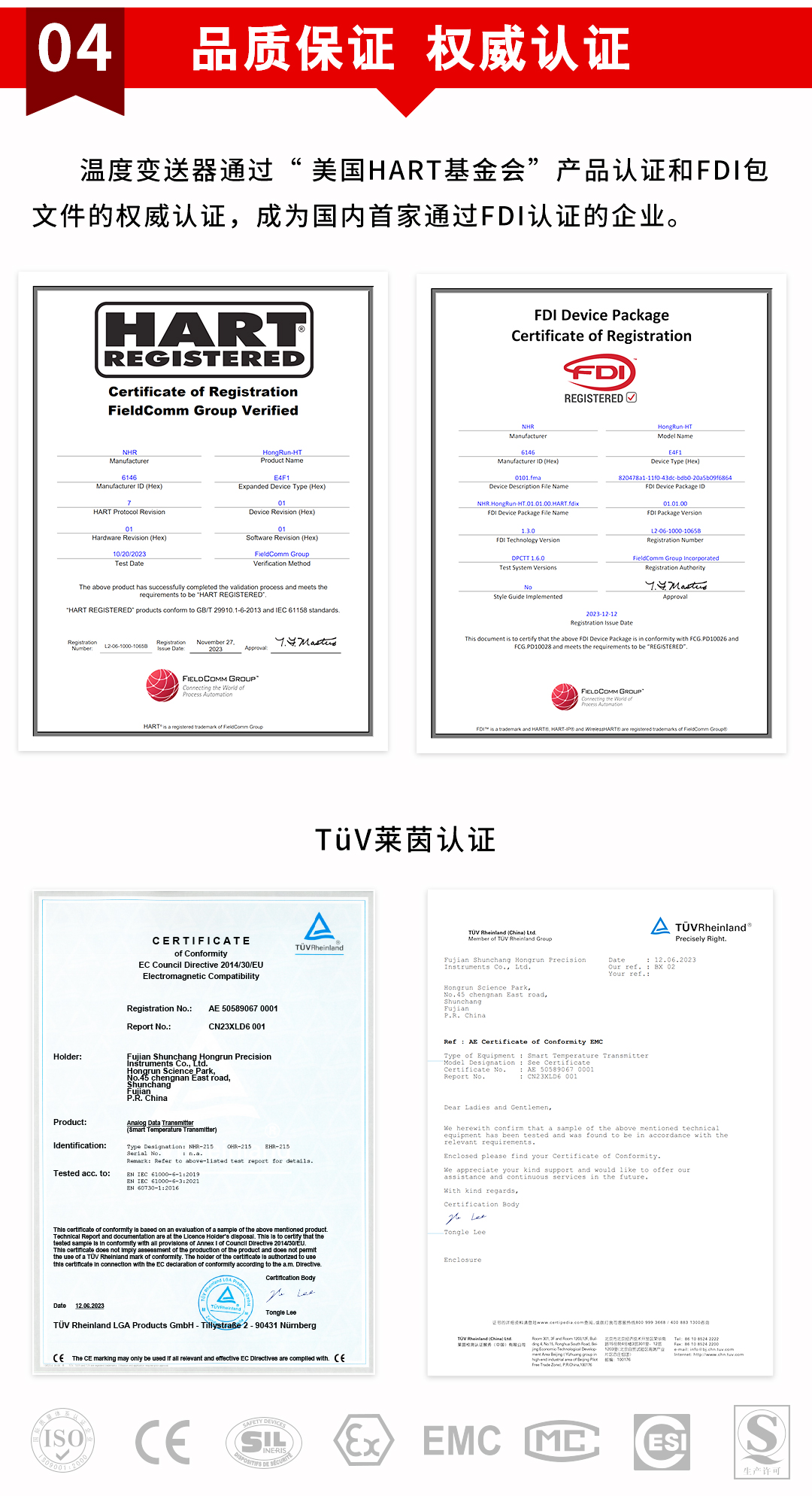 虹潤(rùn)公司是專業(yè)生產(chǎn)溫度變送器的國(guó)家專精特新“小巨人”企業(yè)。生產(chǎn)的智能溫度變送器,具有適配各類溫度傳感器,精度高,通過(guò)編程線修改輸入信號(hào)類型及量程,高抗干擾,HART或485通訊等特點(diǎn)。該產(chǎn)品不僅通過(guò)HART基金會(huì)認(rèn)證、德國(guó)萊茵 CE 認(rèn)證與 SIL 功能安全認(rèn)證,還獲得具備減震抗干擾能力的溫度變送器、信號(hào)隔離器、一種二端子模塊、無(wú)源信號(hào)隔離器等4項(xiàng)國(guó)家發(fā)明專利,主持起草物聯(lián)網(wǎng)智能溫度儀表、現(xiàn)場(chǎng)設(shè)備工具(FDT)接口規(guī)范、工業(yè)過(guò)程測(cè)量和控制系統(tǒng)用溫度變送器等3項(xiàng)國(guó)家標(biāo)準(zhǔn),以及通信系統(tǒng)多通道數(shù)據(jù)采集控制終端規(guī)范軍用標(biāo)準(zhǔn),參與國(guó)際5G標(biāo)準(zhǔn)制定,取得HART溫度變送器、智能溫度變送器等3項(xiàng)相關(guān)軟件著作權(quán)。產(chǎn)品廣泛應(yīng)用于石油、化工、電力、冶金、制藥、食品、水處理等各種工業(yè)領(lǐng)域。
