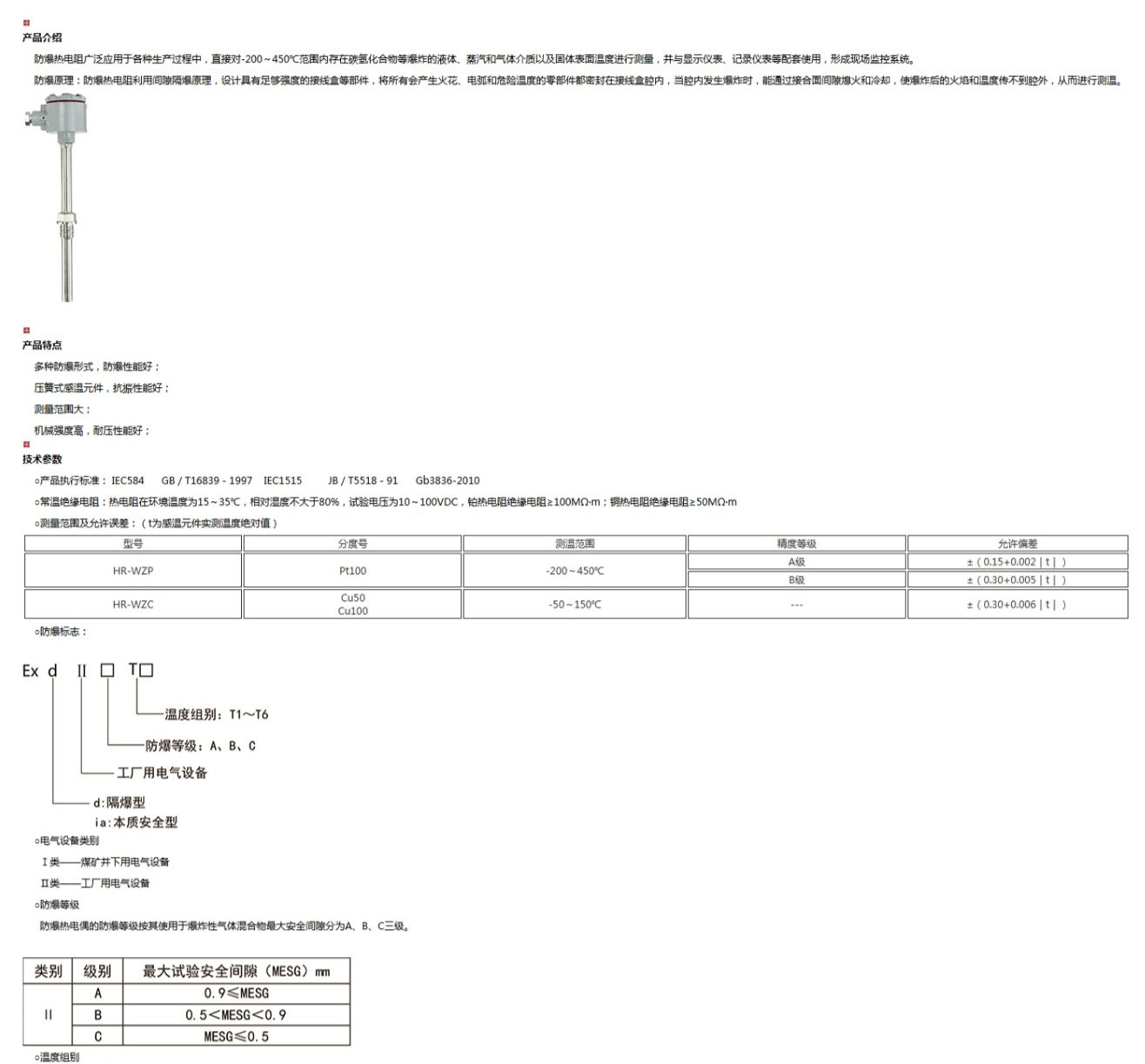 防爆熱電阻廣泛應用于各種生產(chǎn)過程中,直接對-200~450℃范圍內(nèi)存在碳氫化合物等爆炸的液體、蒸汽和氣體介質以及固體表面溫度進行測量,并與顯示儀表、記錄儀表等配套使用,形成現(xiàn)場監(jiān)控系統(tǒng)。
