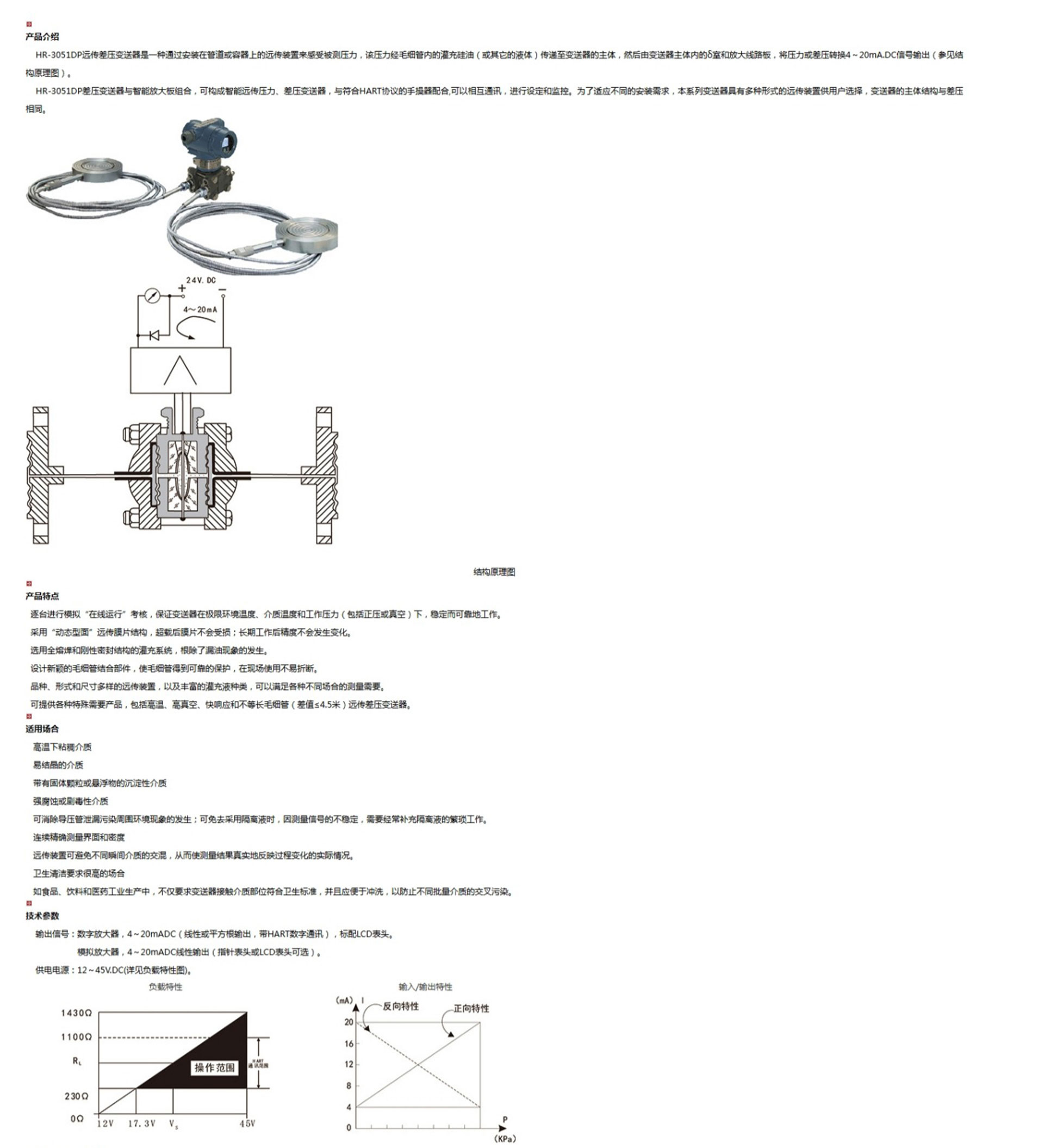 HR-3051DP遠傳差壓變送器是一種通過安裝在管道或容器上的遠傳裝置來感受被測壓力,該壓力經(jīng)毛細管內(nèi)的灌充硅油(或其它的液體)傳遞至變送器的主體,然后由變送器主體內(nèi)的δ室和放大線路板,將壓力或差壓轉(zhuǎn)換4~20mA.DC信號輸出。